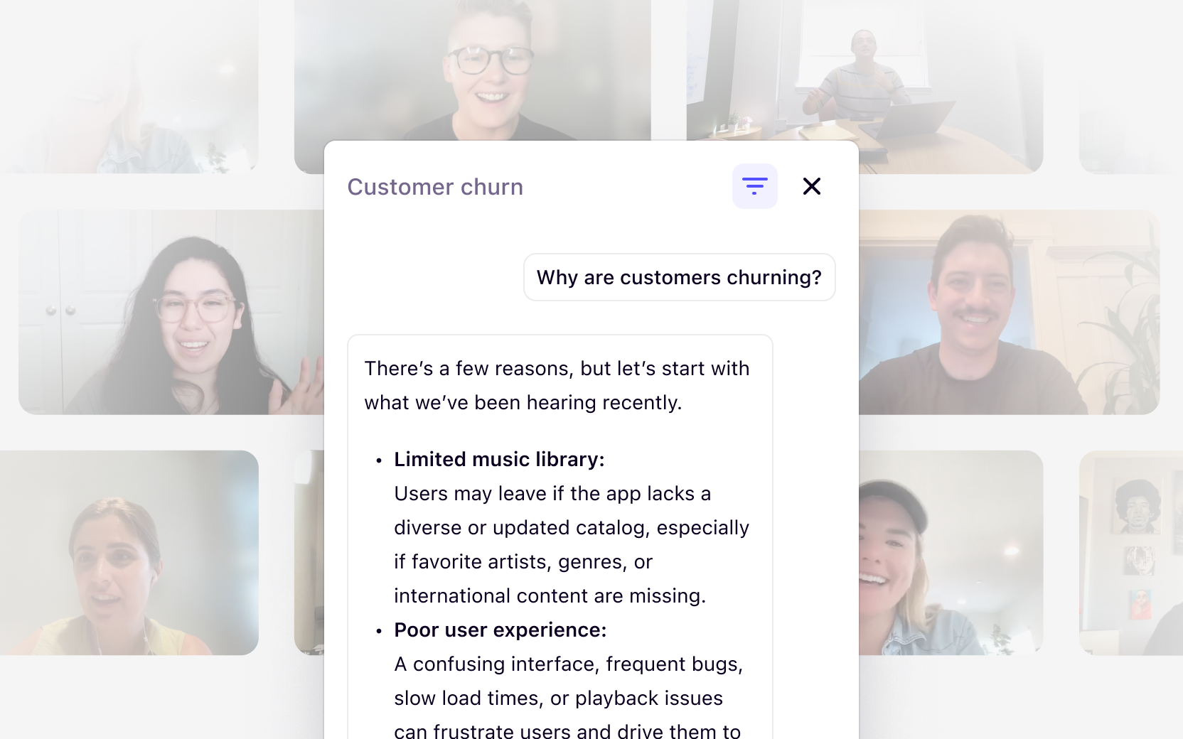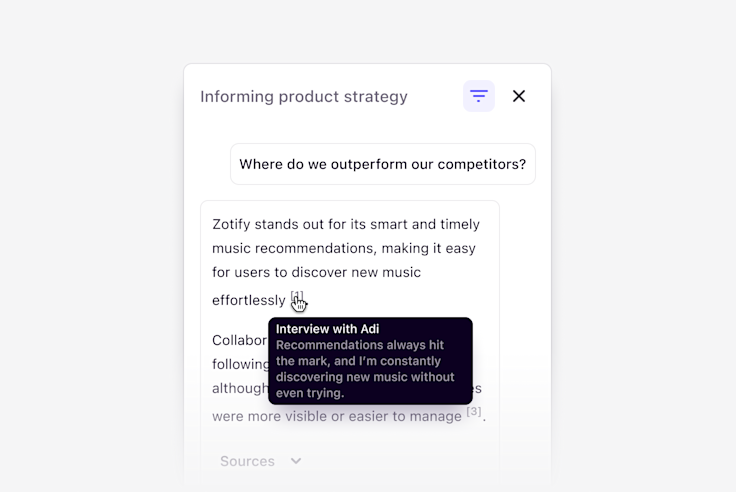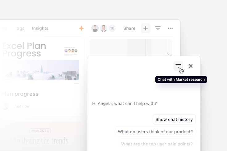 Powered by AI, contextual chat enables you to interact with interviews, research projects, channels, sales calls, and more, and get instant insights to help you make better, more strategic decisions.