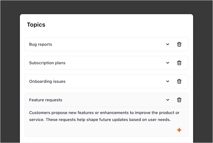 At the time of release, our hypothesis was that each feedback type would share its own set of common topics. For example, we pre-defined topics like Feature requests and Technical issues for support tickets whereas we had Pricing and Missing features for churn reason analysis. It was the right direction, but in practice, these categories often ended up being either too broad or not quite relevant.