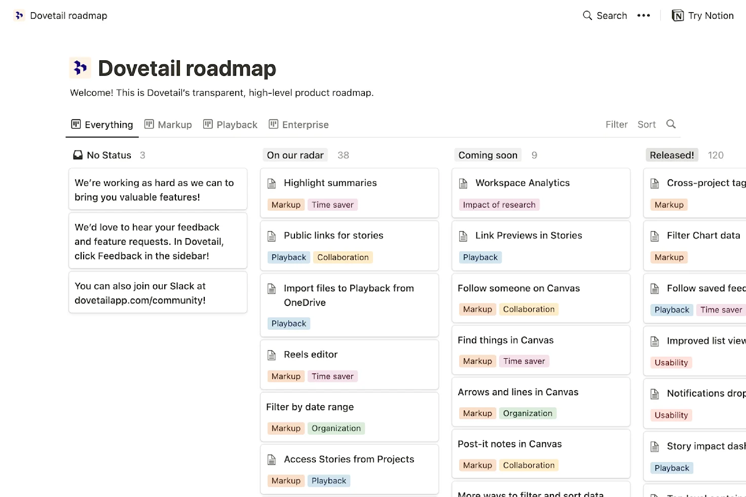 At its core, Dovetail drives productivity. You can do more research faster, analyze it more efficiently, and generate more insights. But we also believe that customer understanding should be at the core of every product decision and building in inherent virality and collaboration helps researchers be much more impactful. Ongoing usage of Dovetail should drive someone to come back more and more frequently, and engage others in research. After all, customer insights that nobody consumes are pointless. Building ‘inherent virality’ into the core feature set and user journey is key to making that a reality. For example, sharing research outputs should be seamless. Dovetail should integrate seamlessly with other tools so customer knowledge can be embedded in core workflows. It should be simple to trace a piece of customer knowledge to a design in Figma, a ticket in Jira or embed a video highlight in a Notion page.