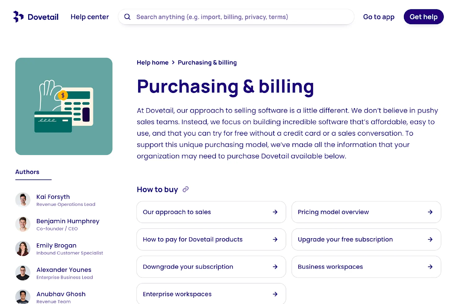 Our five company values codify how we work together and what we believe in. Many companies have values like these to reinforce culture. We use them to guide how we work, but we also leverage our values to reinforce the core of our business—our product-led growth model.Our value “if we do it; we nail it” drives a focus on quality, especially on the experience that end users have when initially purchasing and then using Dovetail day-to-day. While most products that follow a PLG strategy can be bought on a credit card in a ‘self-service’ manner, we went the extra mile to ‘nail it’ and built a section on our help center dedicated to purchasing and billing to help people buy Dovetail without talking to a human (or their boss). “If we do it, we nail it” also emphasizes how first impressions matter and how we sweat the details, both of which help remind us to invest in an intuitive experience so that end users reach ‘aha!’ moments quickly.