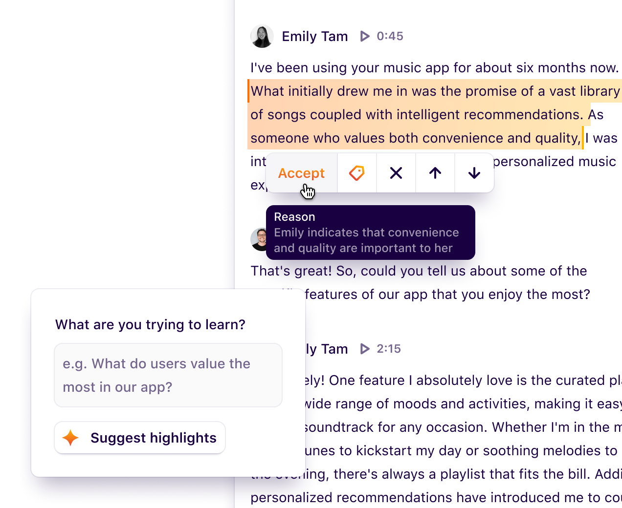 Simply click “Suggest” and see what Dovetail has to suggest. When you get a suggestion, you’ll actually see a reason why Dovetail thinks it’s important. You can go through and accept or reject these highlights.