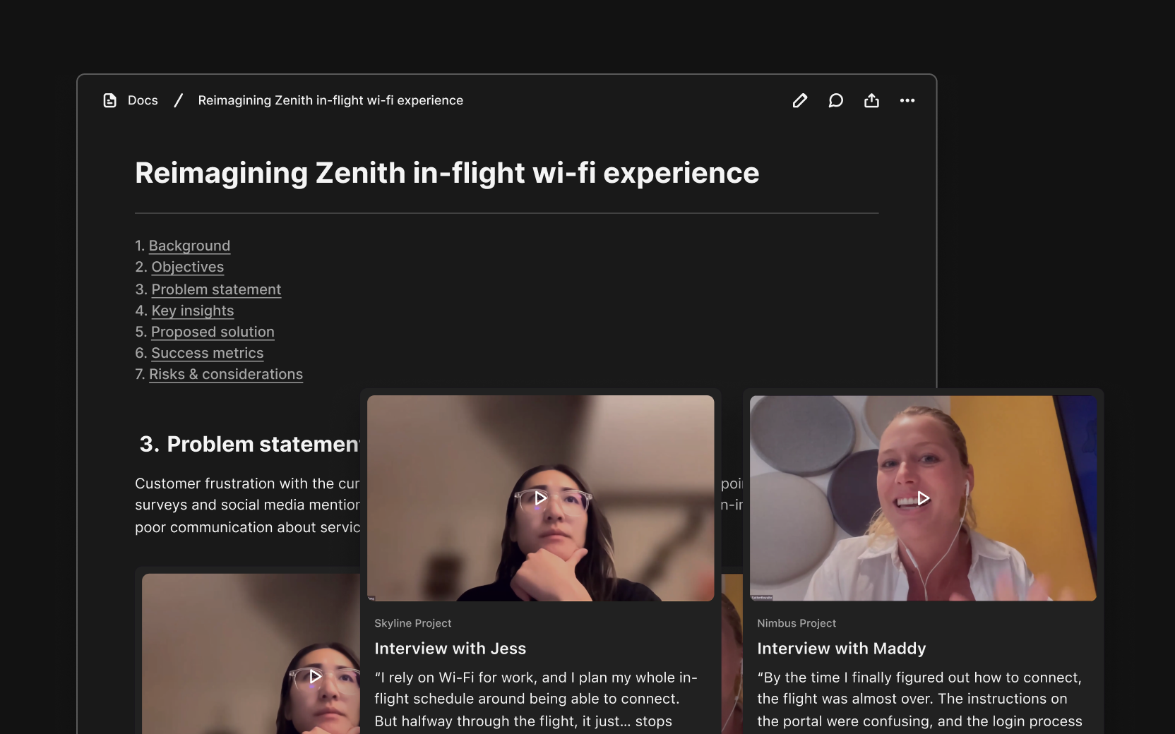 Now, when Eleanor needs to create a product requirements document (PRD), she doesn’t have to start from scratch. She simply asks Dovetail to create a PRD for her. Agentic search performs deep research across multiple types of feedback, and instantly creates the assets she needs to share with stakeholders. These aren’t just generic reports; they are rich, evidence-filled, editable, and collaborative documents. The best part? The report includes video clips and direct links to the customer feedback, so Eleanor can bring the voice of the customer to life and finally get her teams aligned on a shared vision.