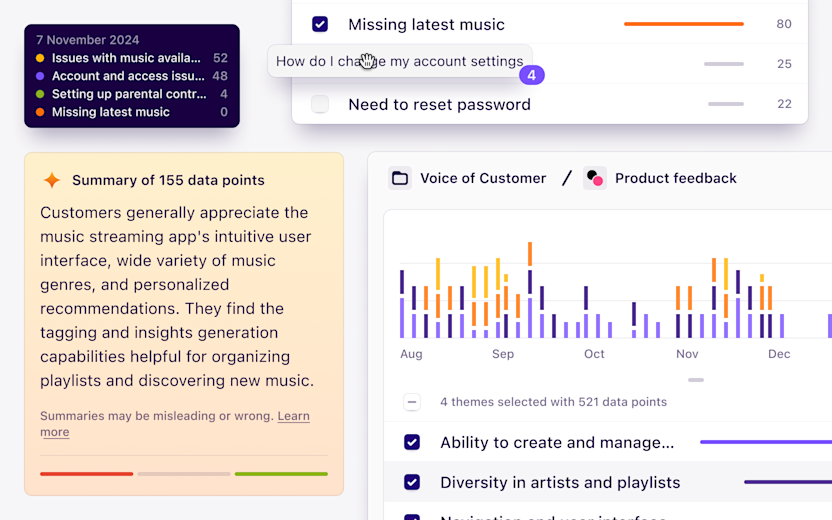 Examples of automated theme summaries, with sentiment, in Dovetail Channels.