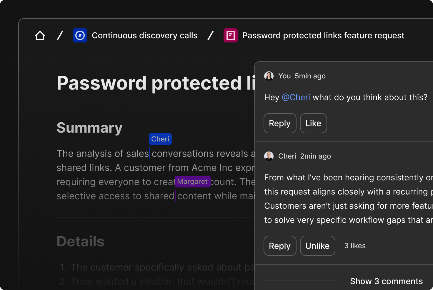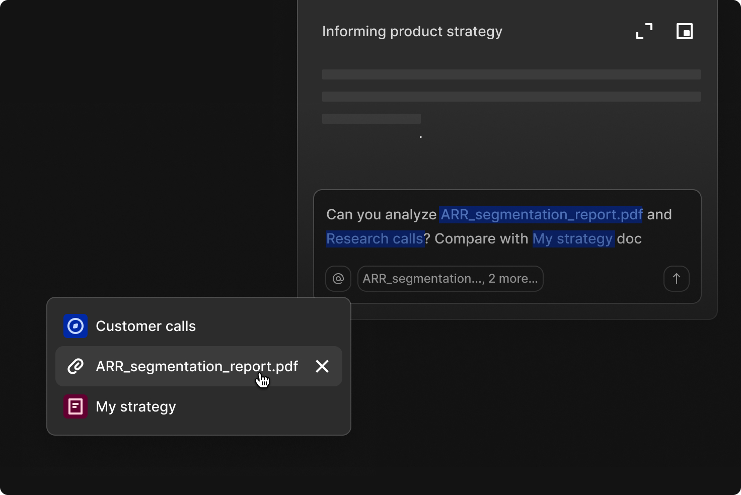 When Dovetail is connected, the answers are fundamentally different. Claims trace back to real people. Feedback filters by segment, ARR, plan tier. Insights are grounded in evidence, not inferred from thin context. And the same intelligence is available to everyone—not locked in one person's ChatGPT chat history.