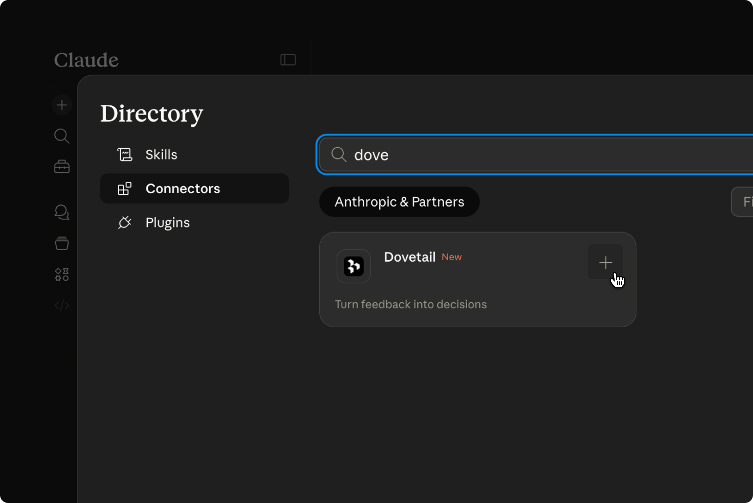 Claude—Connect Dovetail to Claude Desktop or Claude Code via our MCP server. Your workspace becomes a live data source that Claude can query.