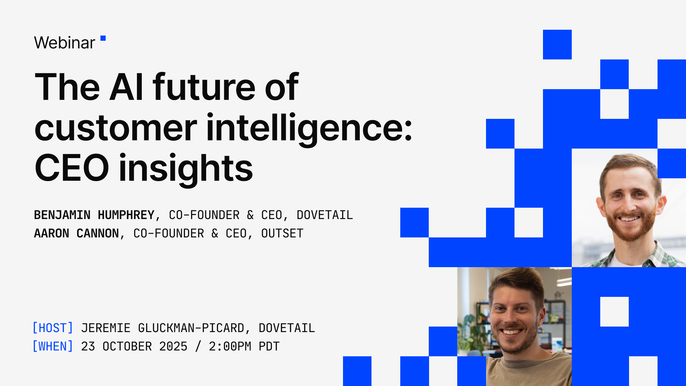 Join Benjamin Humphrey (CEO & Co-Founder, Dovetail) and Aaron Cannon (CEO & Co-Founder, Outset) for a CEO-level conversation on the AI future of customer intelligence. Together, they’ll explore how AI is reshaping the way organizations learn from customers and, more importantly, how it empowers leaders to: