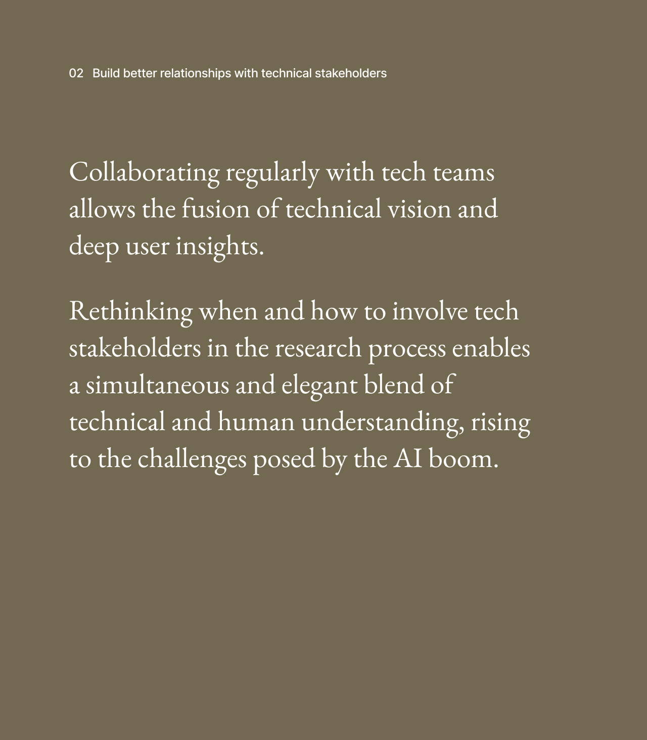 The artificial intelligence boom requires a new level of tech and human understanding that is simultaneous and elegant. Building better relationships with technical stakeholders is a good way for UXRs to rise to the occasion.
