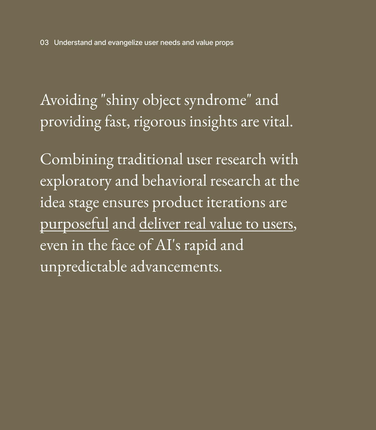 This has always been true about the role of UXR—but the unprecedented pace and unpredictable direction of AI make it easier to do quick, evaluative research and miss the opportunity to help product stakeholders prioritize what actually gives tangible value to users.