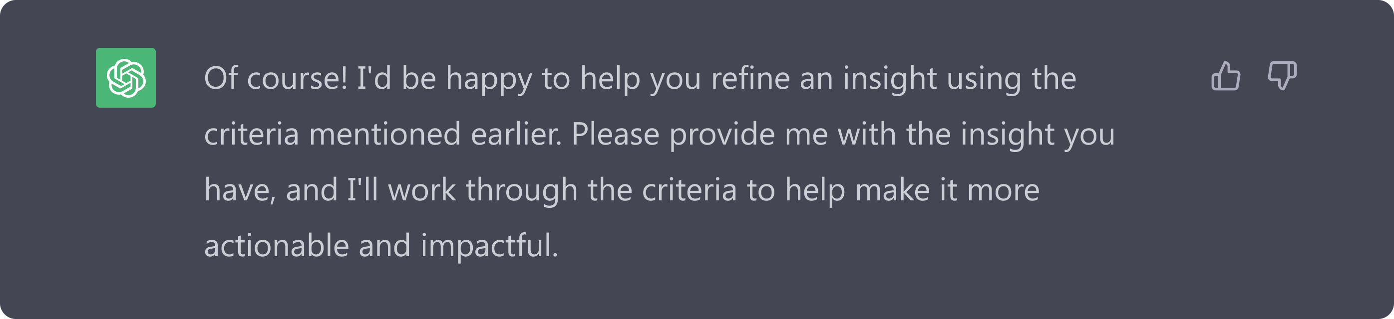 A conversational assistant can be your best friend if you need help distilling a paragraph of text into a concise insight or for offering ways to rephrase an existing insight.