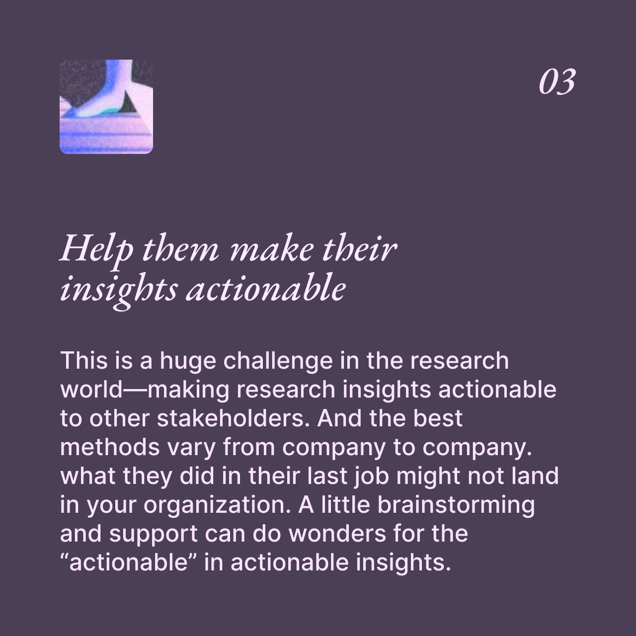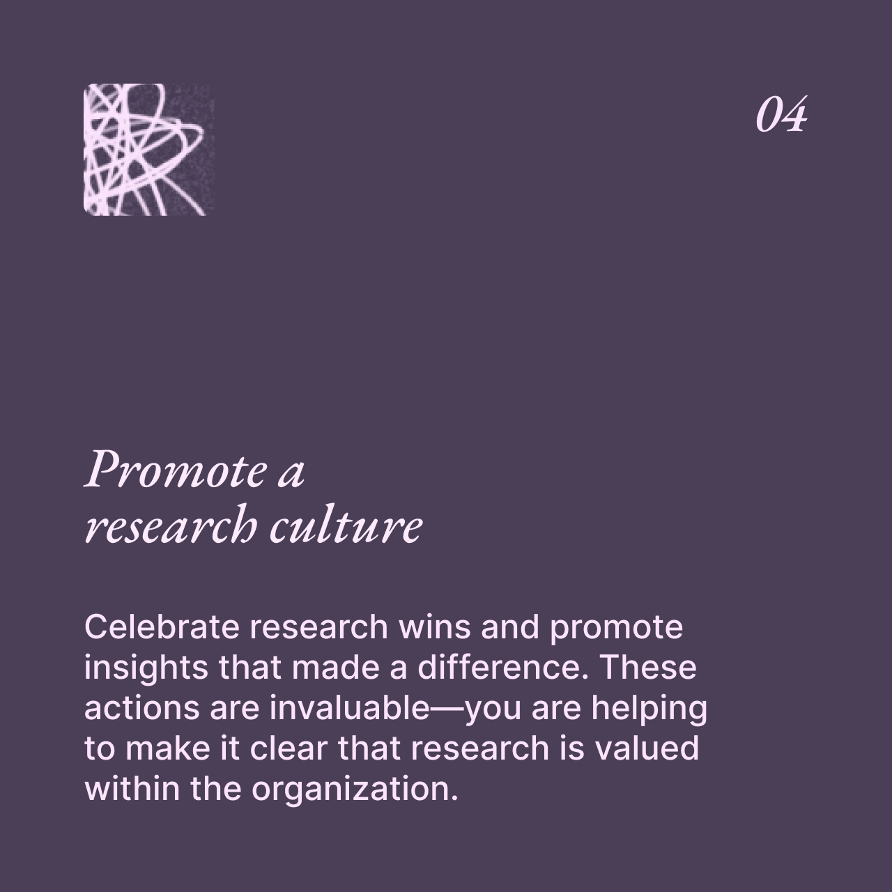 - Encourage them to vocalize their advocacy. These individuals can be powerful advocates for research within the organization. This could involve inviting them to speak at company-wide meetings or providing them with the resources they need to champion research in their teams.