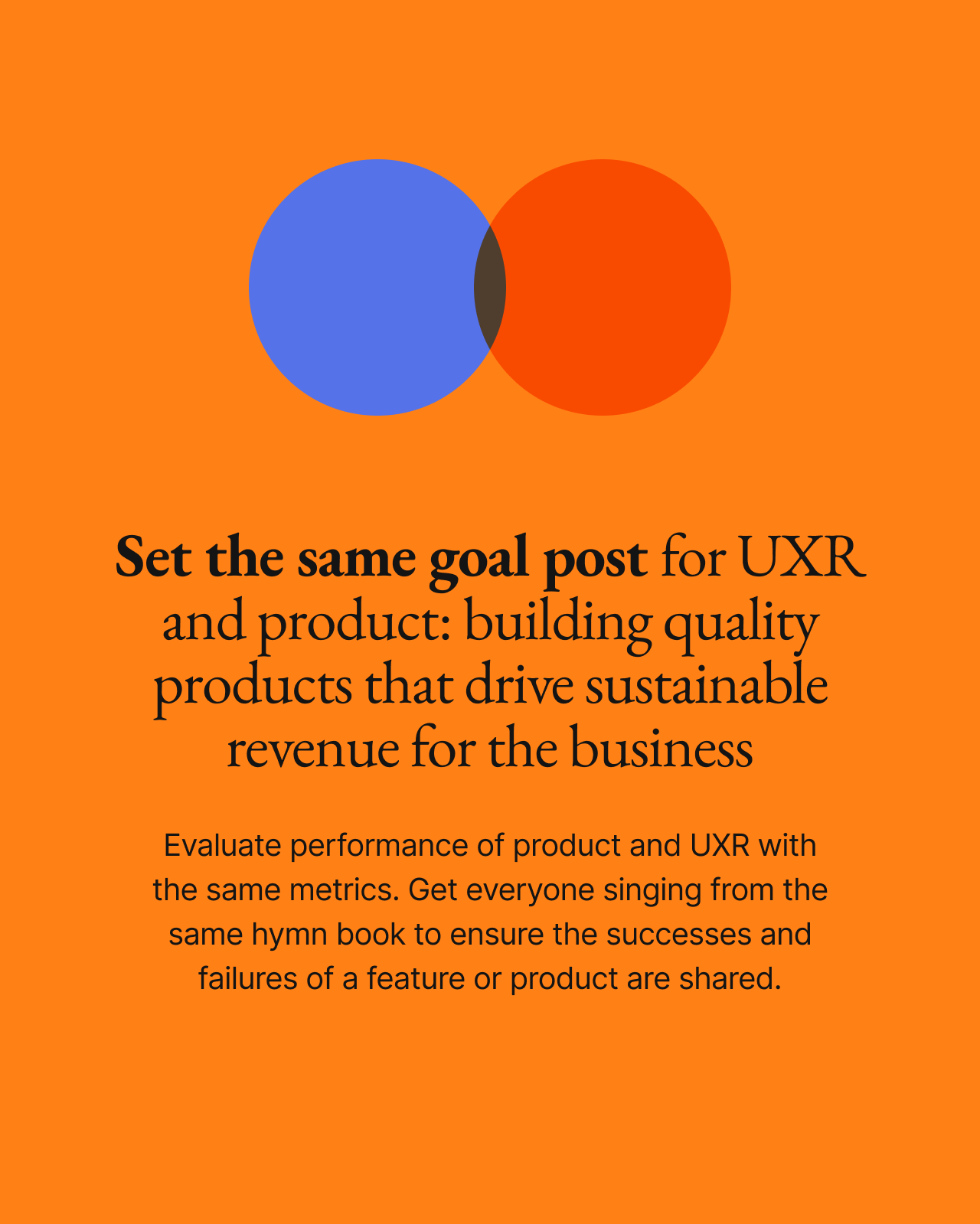 Set the same goal post for UXR and product: building quality products that drive sustainable revenue for the business
