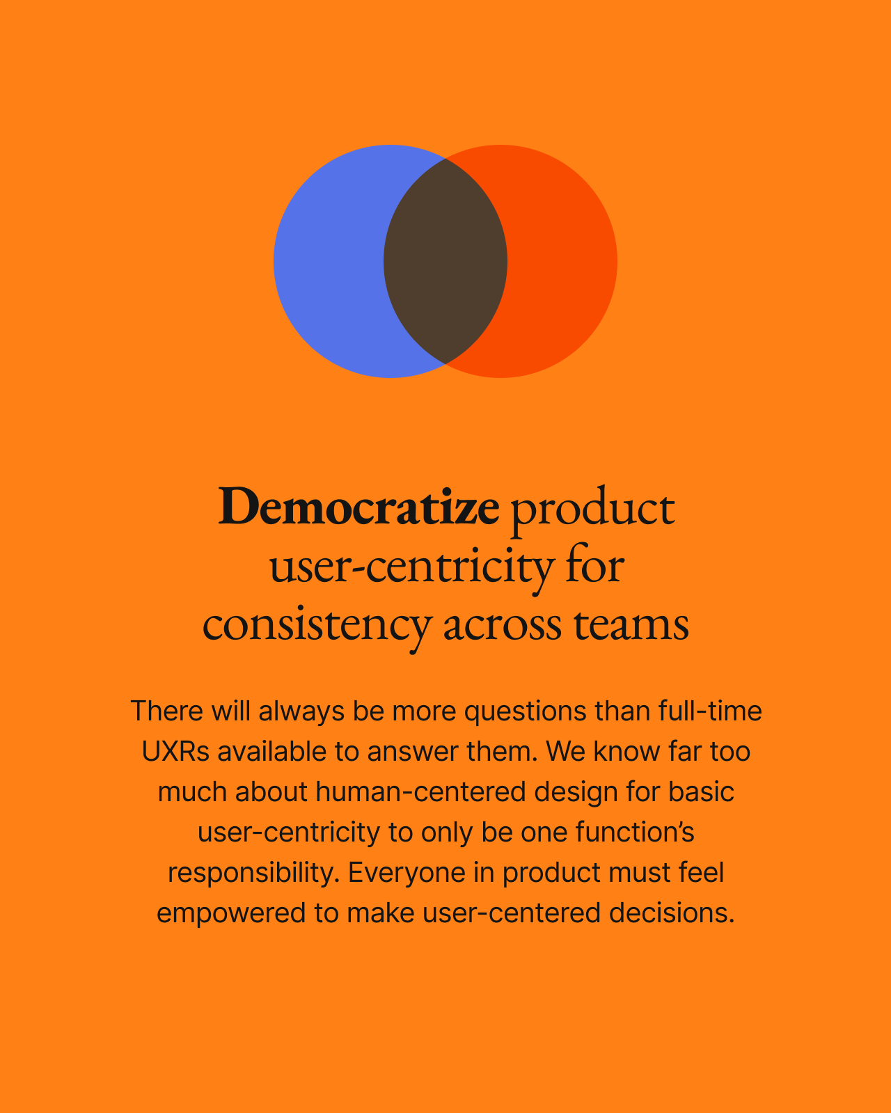 As product professionals, it is our duty to incorporate users into what we build in the face of existing constraints. Who better than tech product teams to innovate around how we procure, store, and leverage research? It’s time that we adapt to a smaller ratio of UXRs within product teams and decentralize the responsibility of centering user needs in product development.