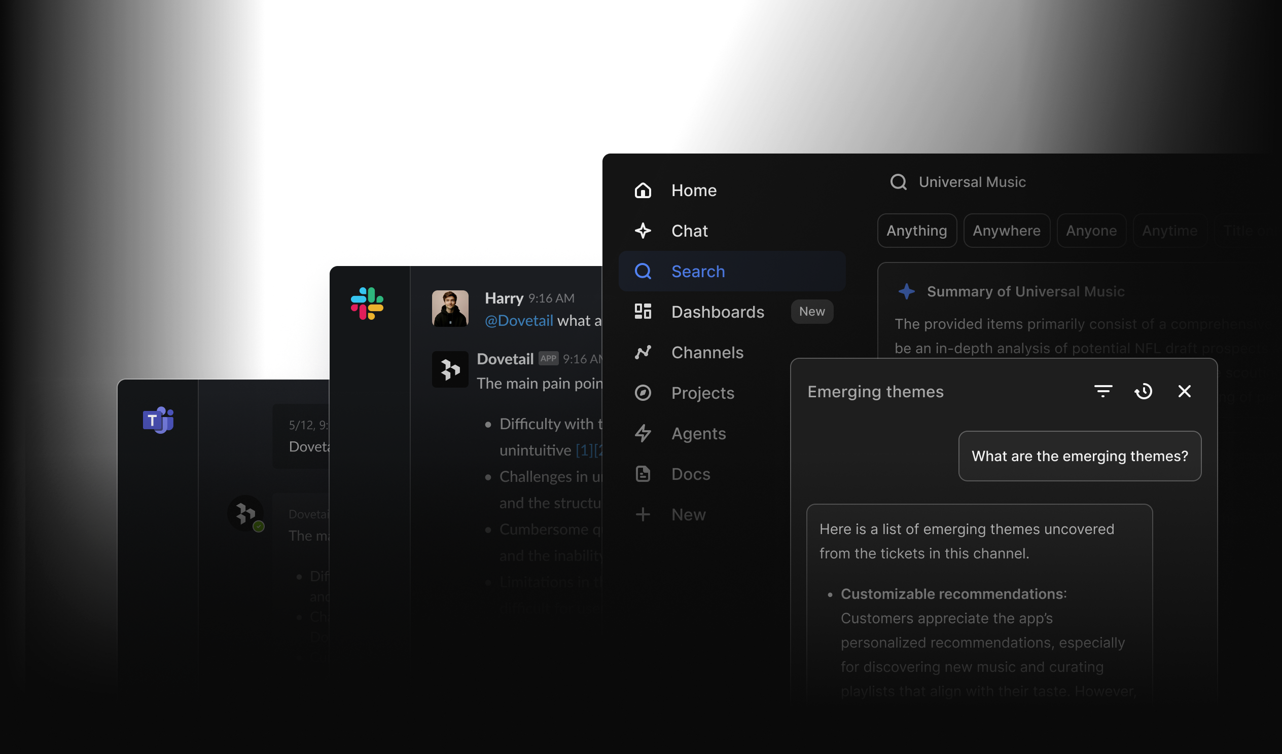 Use it directly in Dovetail, or ask questions from Slack and Microsoft Teams to bring answers into your daily workflows.