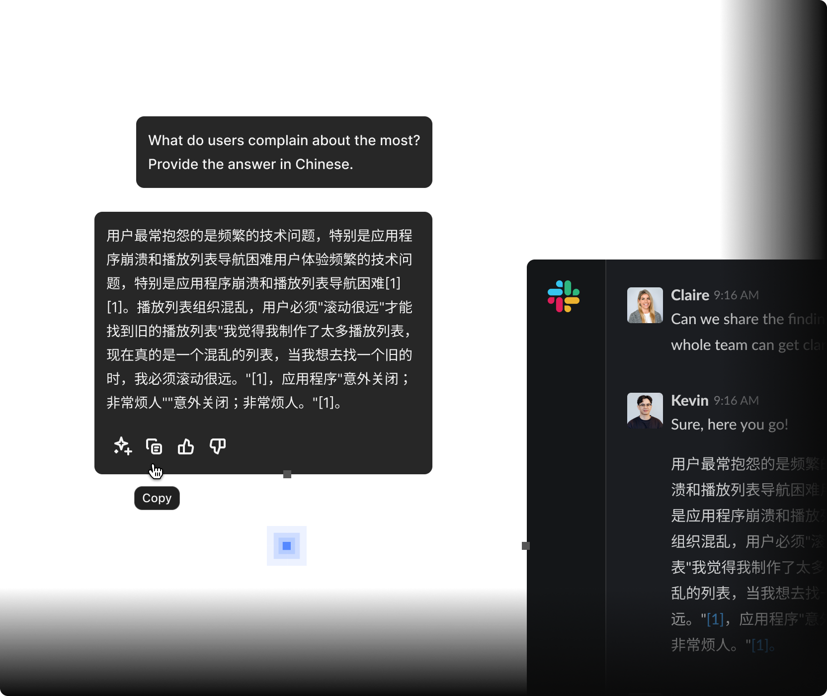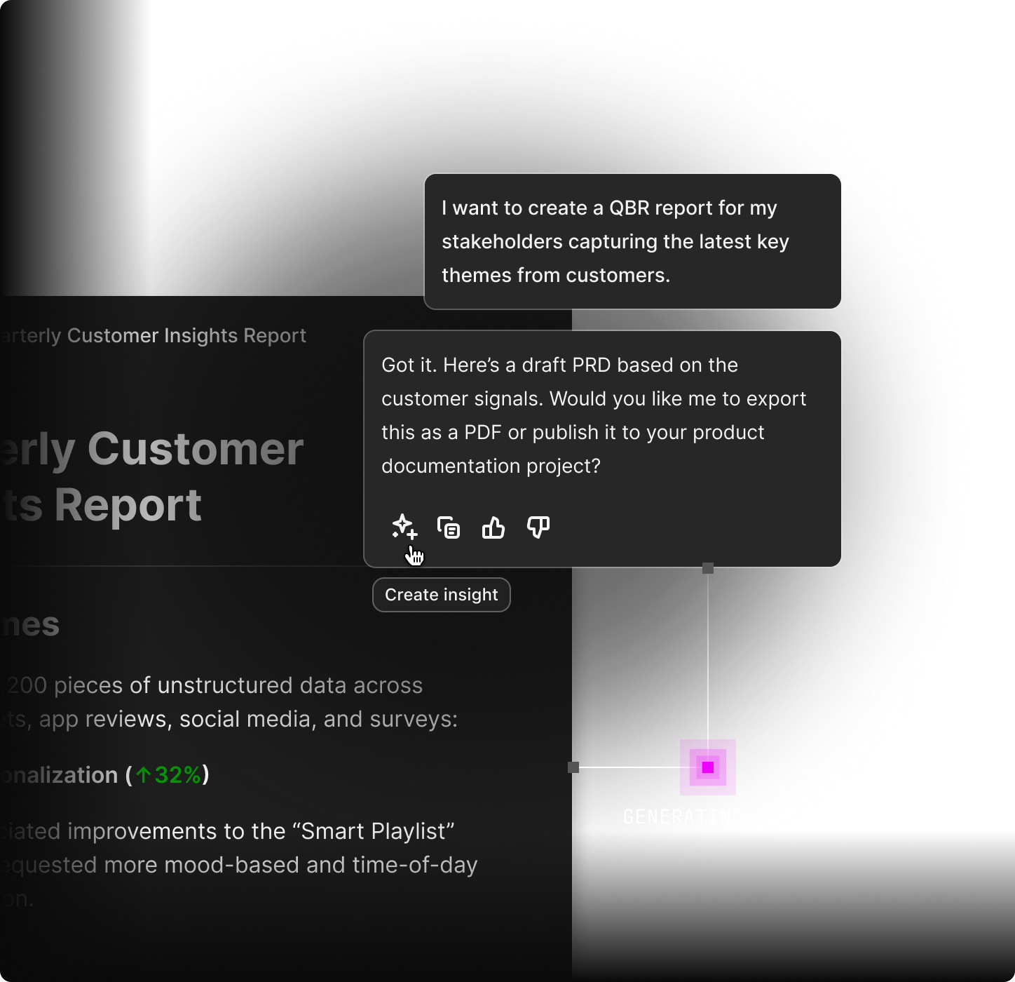 AI-powered chat and search, built for enterprise customer intelligence. Get instant answers grounded in your data—whether you’re in Dovetail, Slack, or Teams.