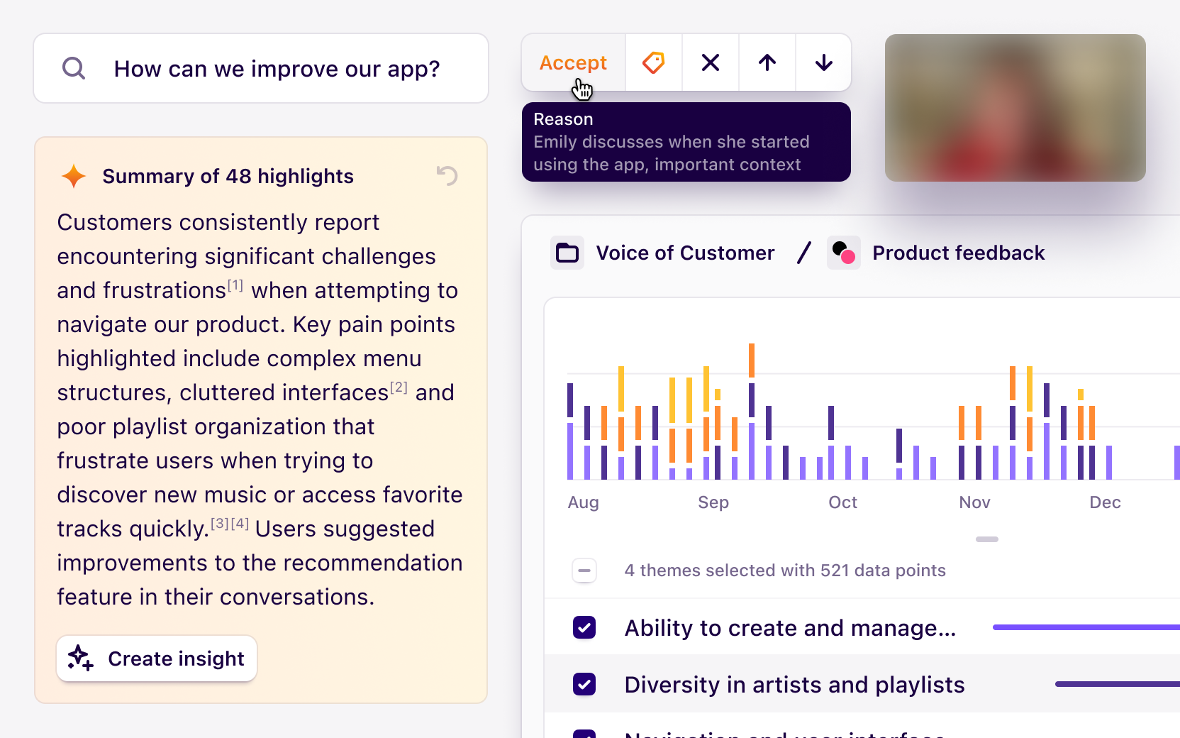 Magic highlight automatically suggests highlights in transcripts, massively reducing manual work. In line with our human-in-the-loop approach, you’re always in control. You can type customer prompts to ensure Dovetail highlights moments that matter to you. Then, accept or reject the highlights to meet your learning goal.