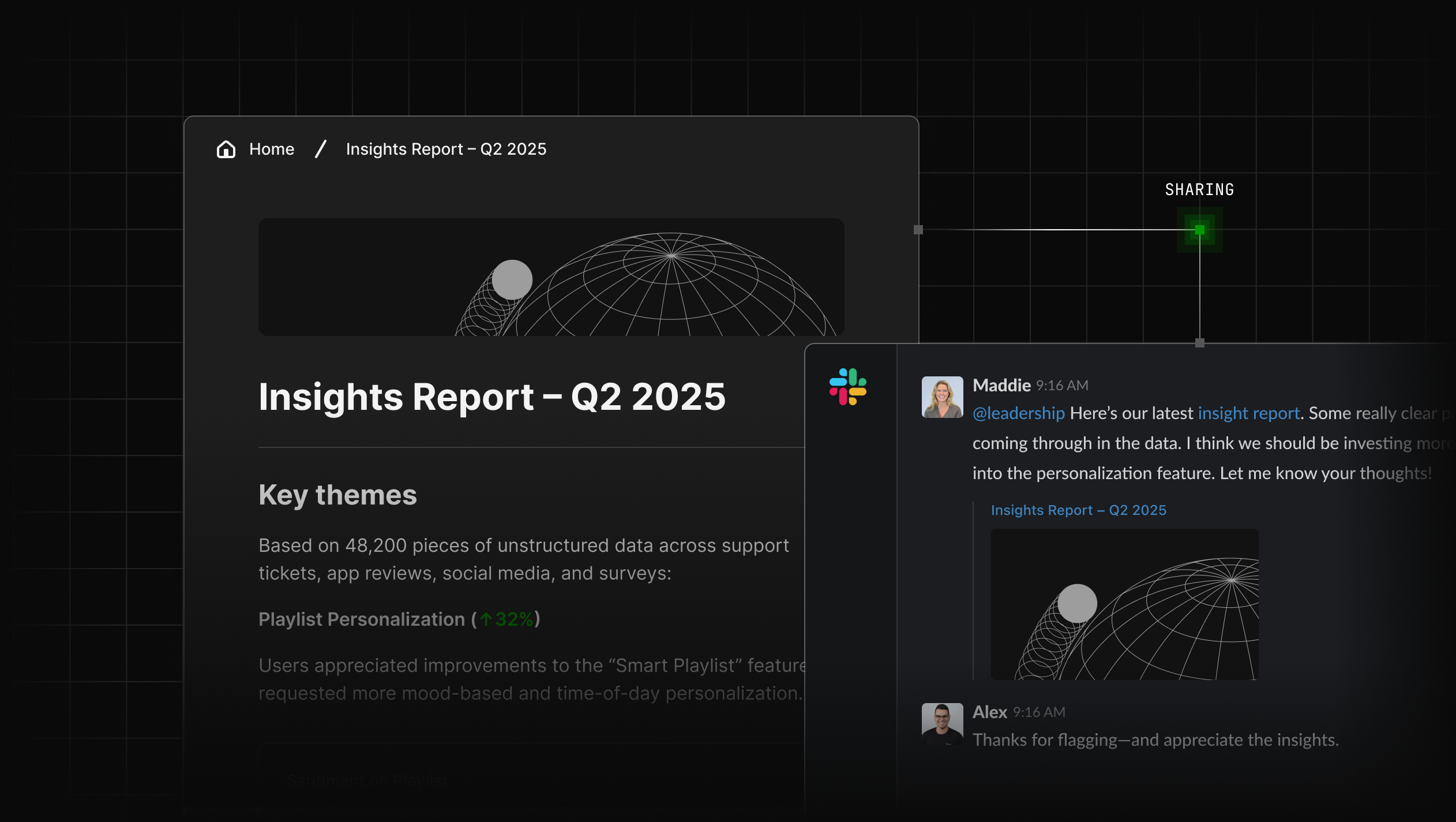 AI-powered chat and search, built for enterprise customer intelligence. Get instant answers grounded in your data—whether you’re in Dovetail, Slack, or Teams.