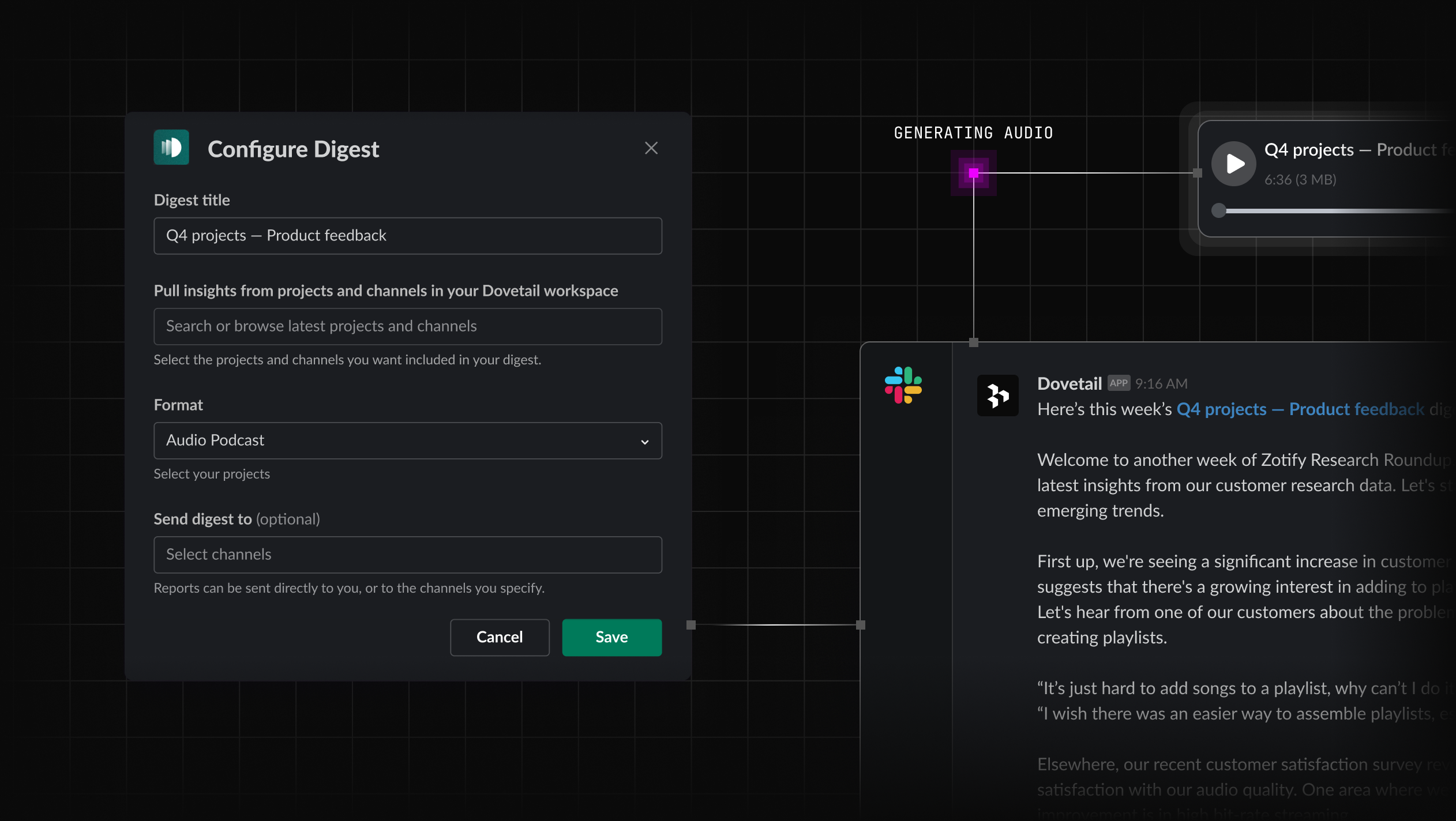 Bring customer intelligence into daily workflows. Ask questions in Slack or Teams and get context-rich answers from Dovetail—or automatically deliver weekly digests of customer voices straight to your channels.