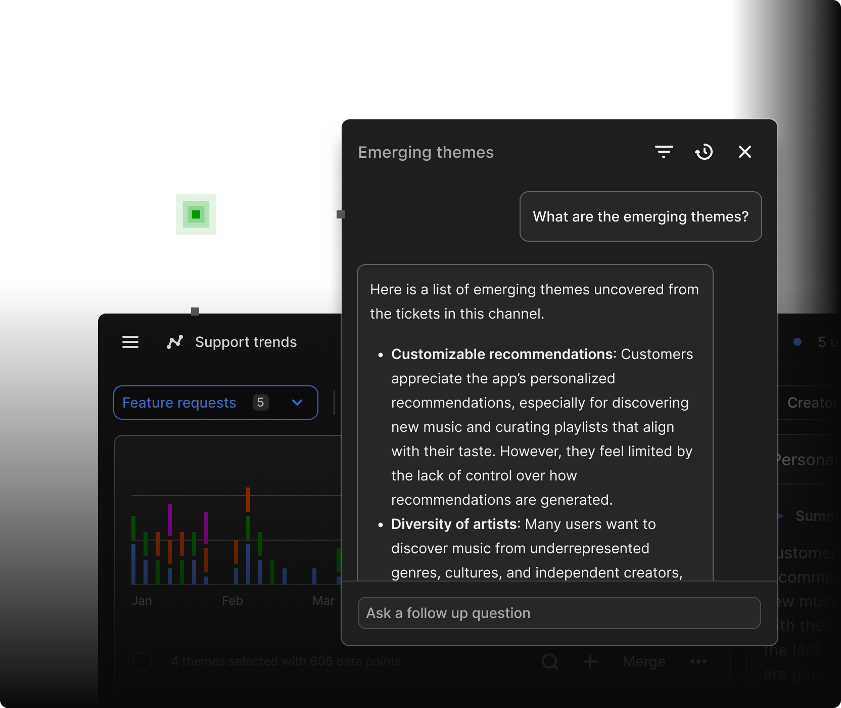 AI-powered chat and semantic search give you instant, contextual answers grounded in your data—whether you're in Dovetail, Slack, or Teams.