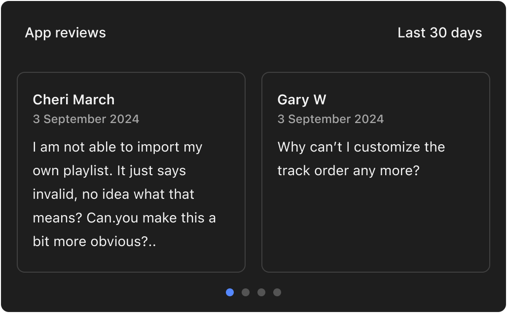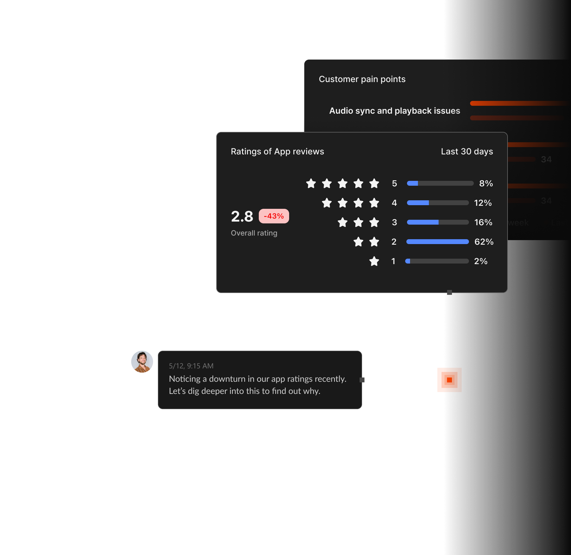 Visualize customer sentiment, feedback themes, NPS, and CSAT in customizable dashboards. Slice across segments to proactively identify risks and measure the impact of your product decisions.