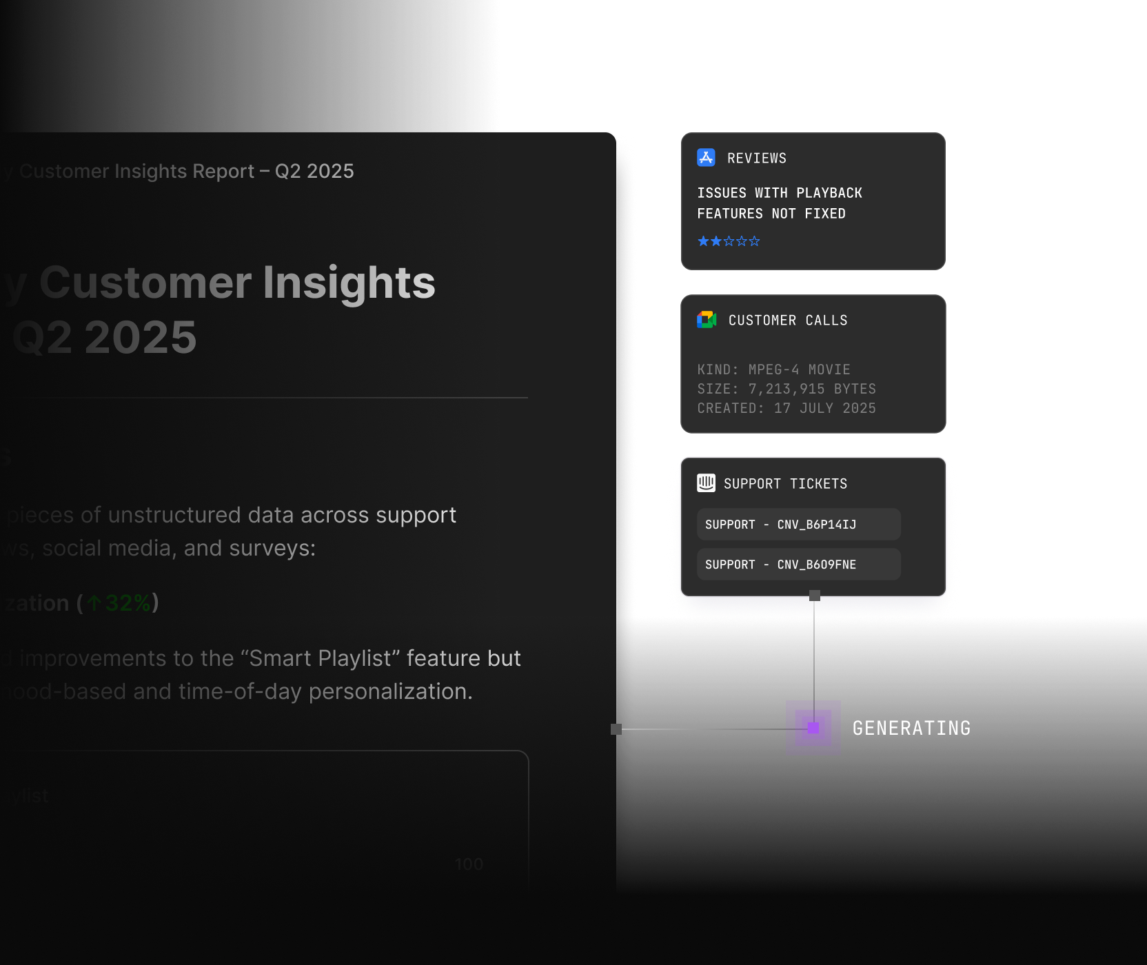 Create product requirements documents, sales recaps, voice of customer reports, go-to-market strategies, research reports, and more in minutes.