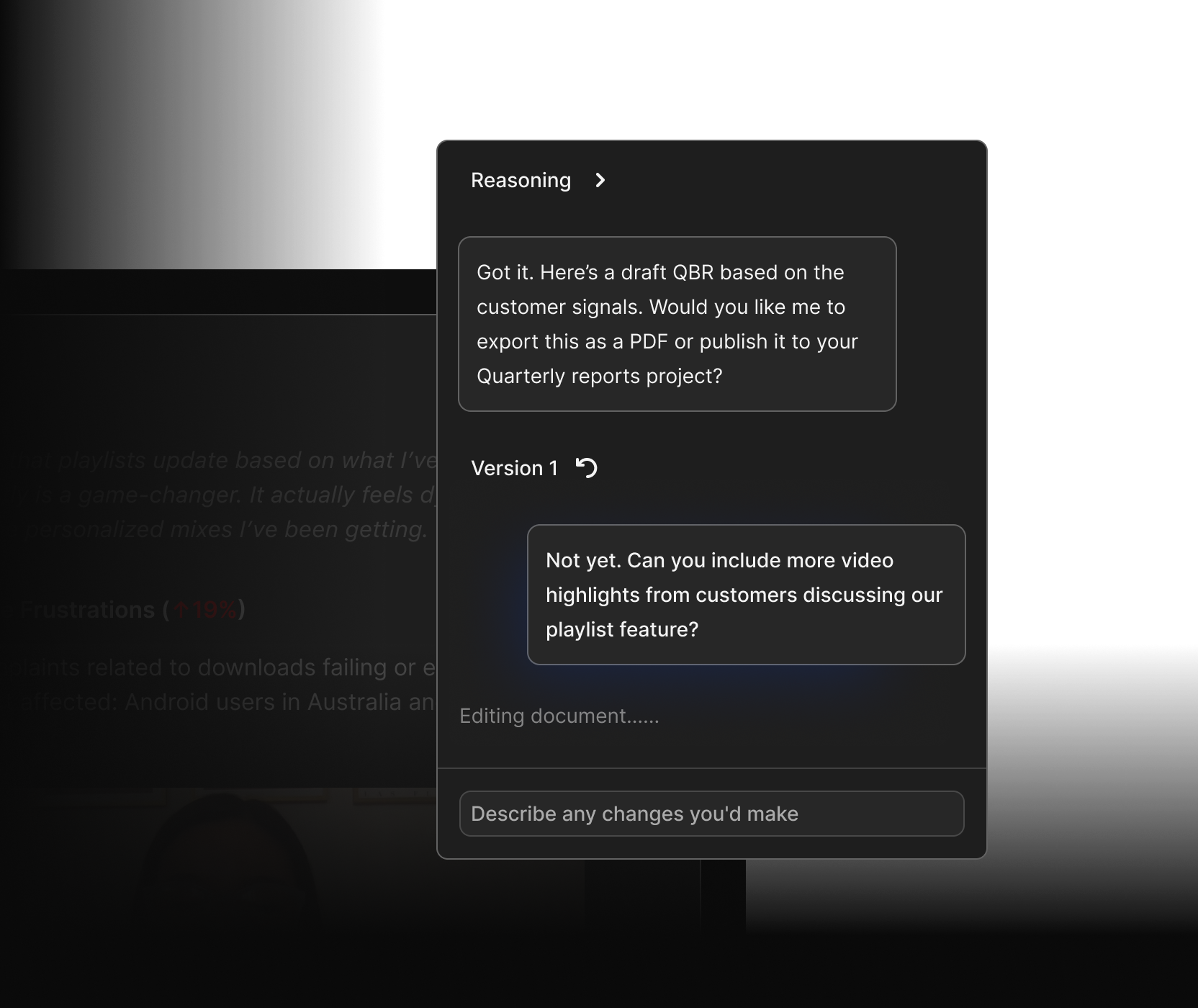 Dovetail's agentic AI synthesizes feedback from all your sources to produce a first draft grounded in evidence.